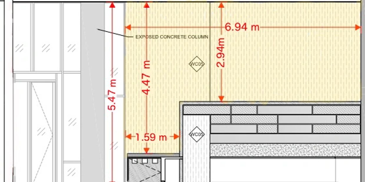 The proposed mural will be featured on the wall behind the main counter in our café. The total mural space spans approximately 6.94 metres in length and up to 5.47 metres in height. The complete dimensions are highlighted in the image provided.